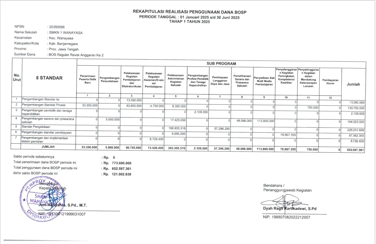 Rekapitulasi Penggunaan Dana BOSP SMKN 1 Wanayasa Periode Tanggal 1 Juli - 31 Desember 2025 Tahap 2 Tahun 2025